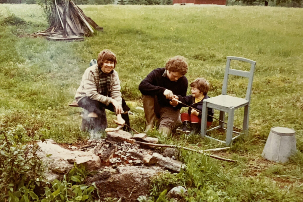 Vi er tre i familien. Mig, min far og min mor. Jeg sidder på jorden, tæt sammen med min far. Vi koncentrerer os om at sætte dej på en pind. Vi kigger ned på det, vi er i gang med.