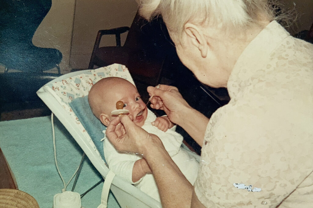 Jeg er meget hos min mormor og morfar som lille. Som hun gjorde med sine egne børn, dedikerer min mormor sig fuldstændig til at passe mig. Billederne viser, hvordan hele spisebordet er ryddet, så der er plads til at pusle og made mig. Et plastikbabysæde bliver stillet på bordet, og jeg bliver anbragt i det, så min mormor kan komme til at få en masse gulerodsmos i mig. Ind med skeen med mosen. Og bagefter ind med sutten, så barnet synker mosen.
